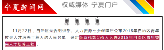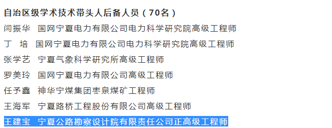 11月22日,寧夏自治區黨委組織部、自治區人力資源和社會保障廳聯合公布了2018年自治區青年拔尖人才培養工程入選人員名單。此次交通系統共入選三人,其中寧夏公路勘察設計院有限責任公司王建寶入選自治區級學術帶頭人后備人員、張繼周入選自治區優秀青年后備骨干人員。