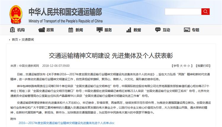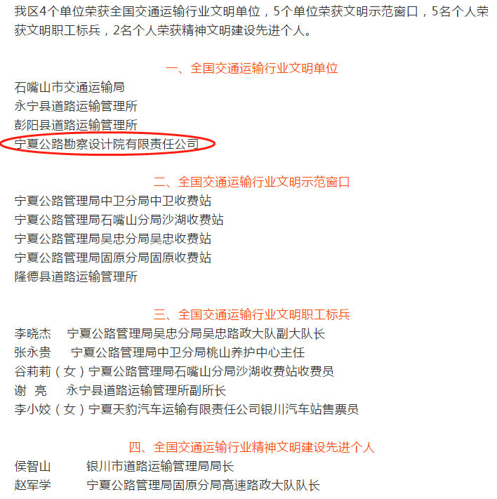 近日,交通運輸部發布《關于表彰2016—2017年度全國交通運輸行業精神文明建設先進集體先進個人的決定》(交政研發〔2018〕162號),對全國交通運輸行業在思想道德建設和精神文明建設中成績突出的先進集體和個人進行表彰。寧夏公路勘察設計院有限責任公司榜上有名,被授予“全國交通運輸行業文明單位”稱號。