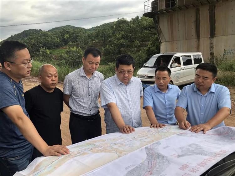 生產(chǎn)與技術(shù)處主任張繼周(左二),現(xiàn)場研究恭城立交設(shè)計方案