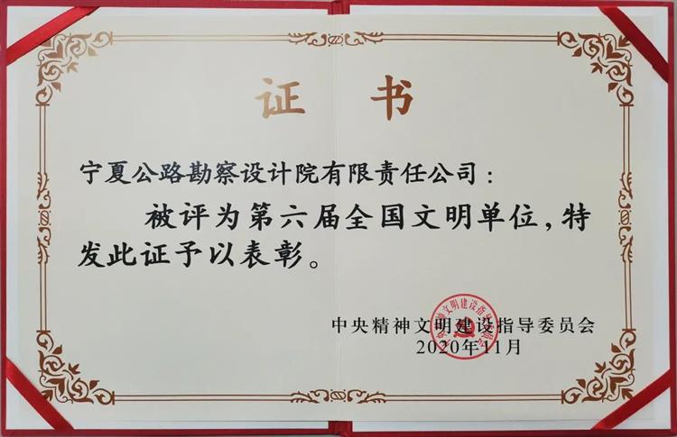 近日,寧夏公路勘察設(shè)計院有限責(zé)任公司榮獲中央精神文明建設(shè)指導(dǎo)委員會“全國文明單位”榮譽(yù)稱號!
