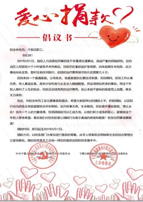 2021年5月1日,寧夏公路勘察設計院職工田佳不幸遭遇交通事故,造成嚴重的顱腦損傷。一場突如其來的事故,將這個年輕人推向了人生低谷,高昂的治療費用也讓他本就不富裕的家庭雪上加霜。寧夏院黨委及工會在得知此事后,在第一時間向全院職工發出愛心募捐倡議,全院黨員干部及職工群眾積極響應,踴躍捐款,短短幾天內就為田佳籌得了8萬余元。