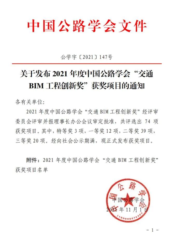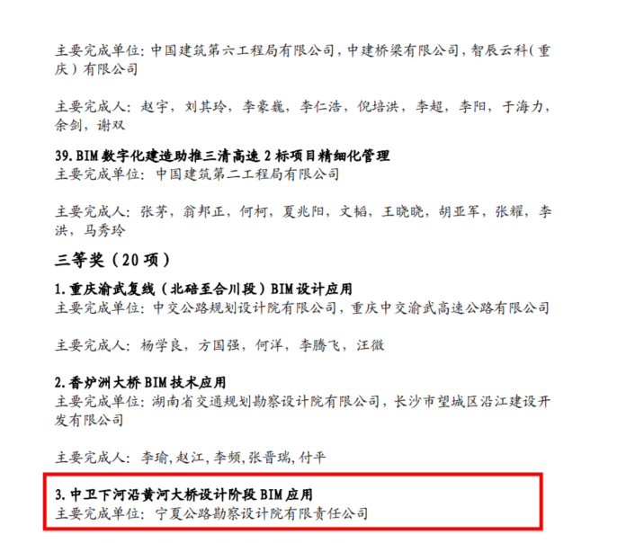 近日,2021年度中國公路學會“交通BIM工程創新獎”評審結果公布,由寧夏公路勘察設計院有限責任公司完成的《中衛下河沿黃河大橋設計階段BIM應用》項目榮獲中國公路學會“交通BIM工程創新獎”三等獎,同時這也是寧夏區內交通BIM技術應用獲得的第一個全國獎項。
