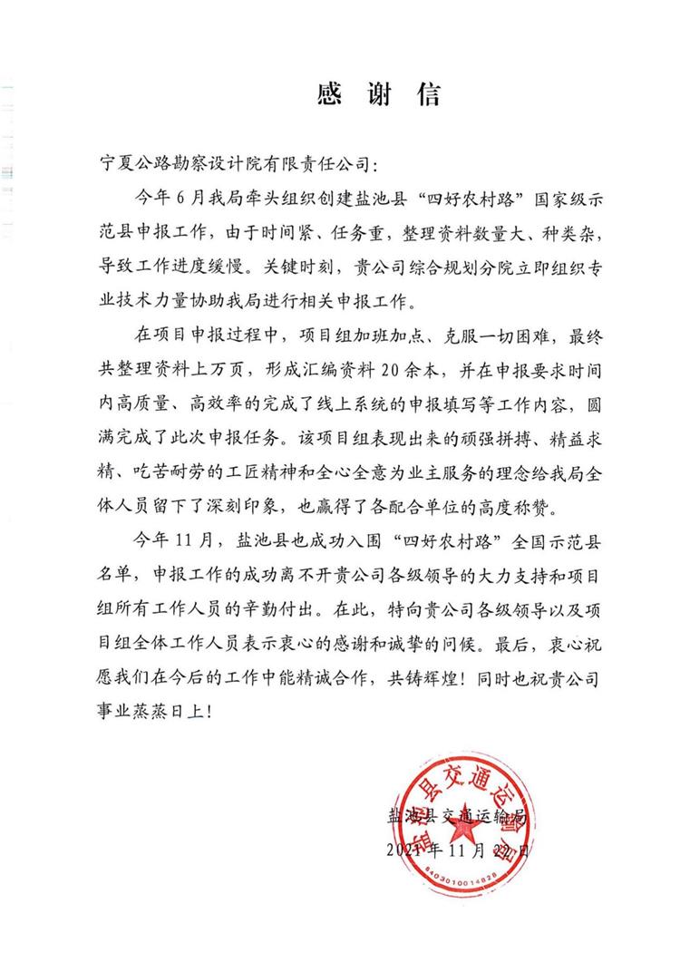近日,鹽池縣交通運輸局向我院發來《感謝信》,并在信中對我院在本次申報工作中的全力支持和辛勤付出表示感謝。