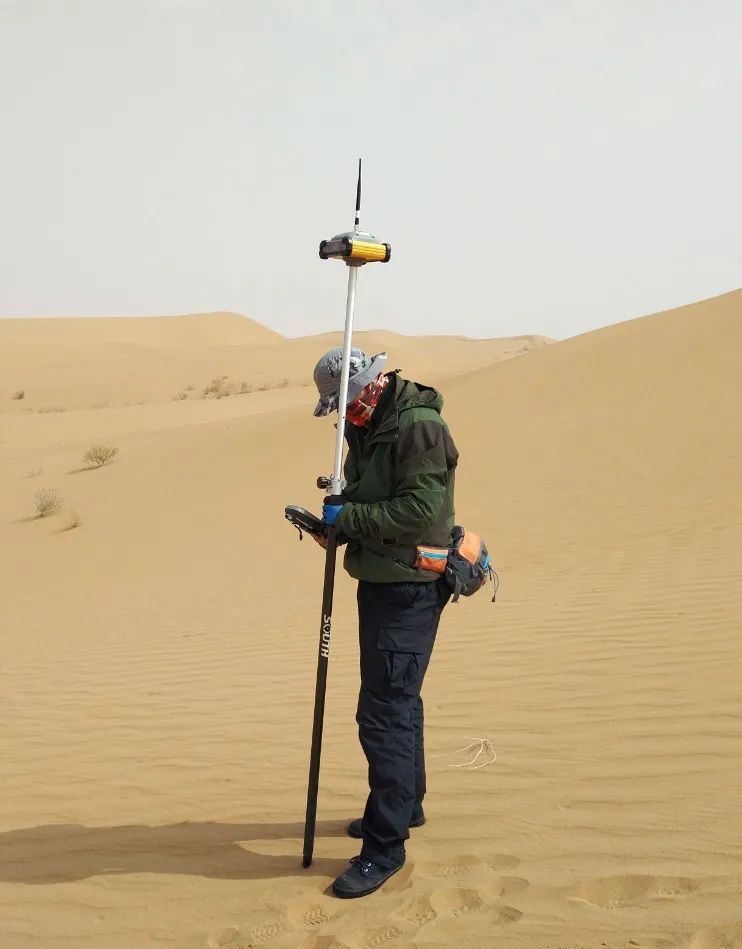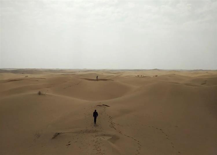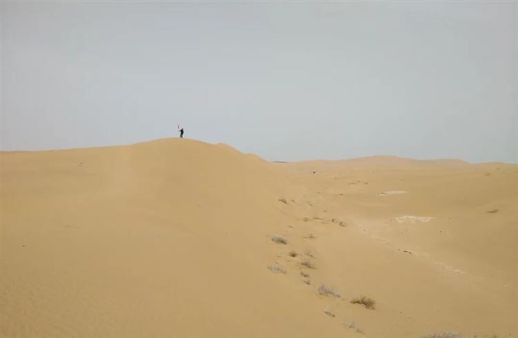 每天微亮的時候,他們把標配6瓶礦泉水和2個干糧裝進背包,再扛上腳架、提上儀器,便開始一天的沙漠負重行軍。這場“沙漠之旅”,從略帶憧憬的“大漠孤煙直”到“飛沙走石迷人眼”,這里并沒有想象中的詩情畫意。但每次,當他們踩在真實的細沙上,瞭望著漫無邊際的荒漠,就更加堅定了初來時“一定要在這里筑路”的信念。