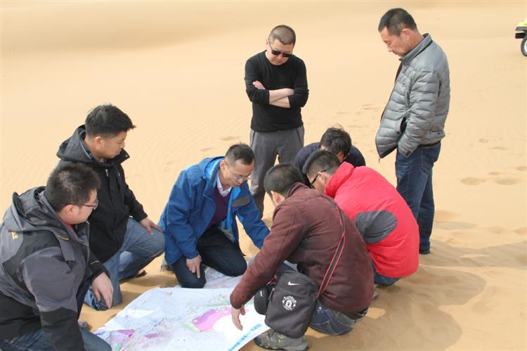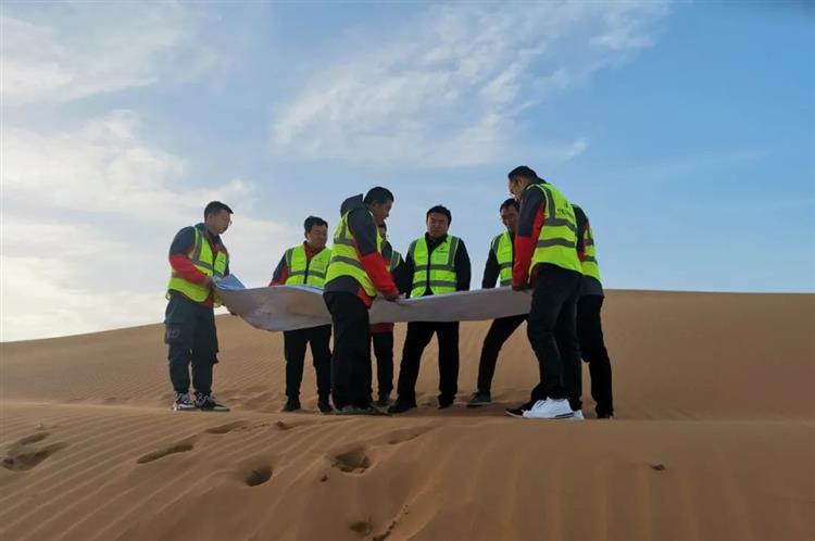 踏勘惡劣的自然環境和復雜的工程地質條件給項目的勘察設計帶來了極大的挑戰。為了確保設計項目能夠按時高質量完成,方案合理可行,寧夏公路院勘測人員先后五次徒步穿越騰格里沙漠,在熾熱的沙海中,頭頂烈日,腳踩黃沙、披星戴月、風餐露宿、在沙漠中開展勘測工作。