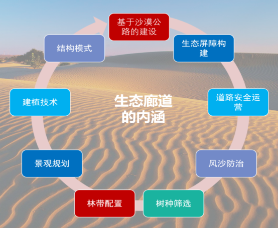 設計團隊在勘測設計過程中成立專門課題組,并貫徹落實綠色公路理念,充分利用現有沙漠資源,圍繞生態屏障構建和道路安全運營,集成風沙防治、樹種篩選、林帶配置和景觀規劃等綜合措施,構建沙漠公路生態廊道建植技術與結構模式,推動生態、經濟和社會協同發展的“生態廊道”的理念運用到公路建設當中。