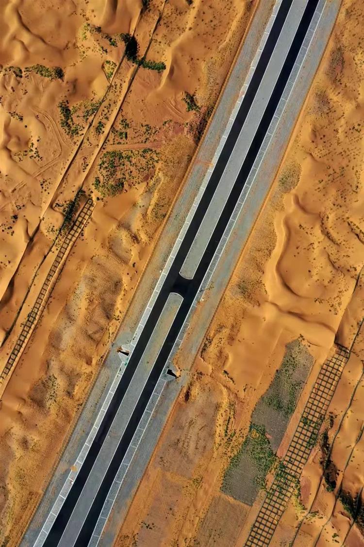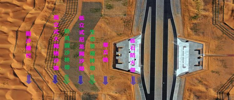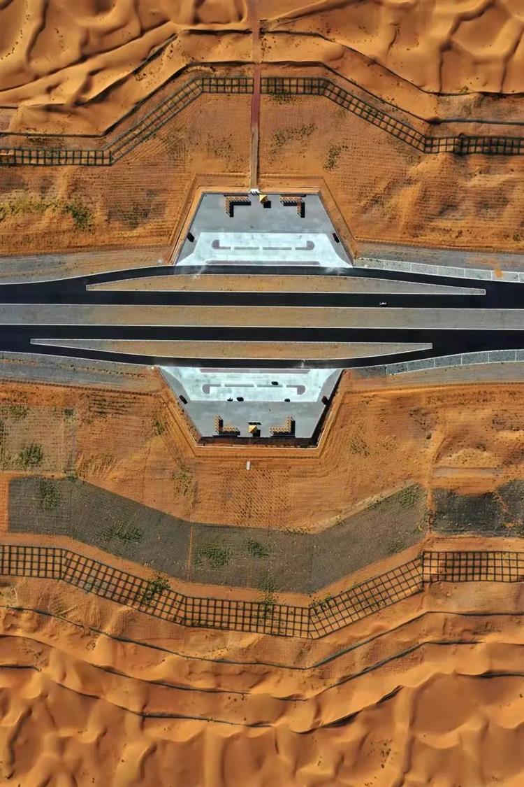設計亮點沙漠公路設計遵循“阻沙先行、固沙為主、固阻結合”的固沙原則,采用如尼龍網高立式沙障、大網格沙障、小網格沙障等一系列新工藝、新材料構建了烏瑪高速公路騰格里沙漠段穩定的工程體系,聯合中國科學院西北生態環境資源研究院通過科學的植物篩選、搭配及先進的建植技術研究,建立了完善的生物防護體系。雙體系將沙漠公路沙害防護寬度由傳統的800米縮減至300米,有效減少了公路用地,節約了建設運維資金。