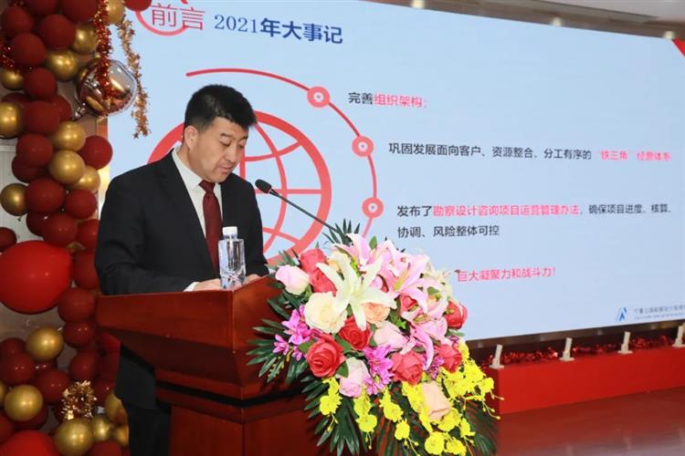 公司黨委書記、總經理趙旭東向大會作題為《把握新發展機遇,譜寫寧夏院高質量發展的時代篇章》的年度工作報告。報告通過經營生產業績、專業板塊發展、企業管理和2022年重點工作四個部分,回顧總結了2021年寧夏院各項工作,認真分析了寧夏院發展面臨的形勢和機遇,并對2022年工作任務進行謀劃部署。
