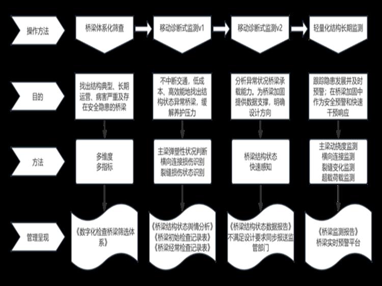這種“一標(biāo)兩輕”的監(jiān)測(cè)模式與現(xiàn)行的橋梁檢查制度相互補(bǔ)充,共同促進(jìn)橋梁養(yǎng)護(hù)管理水平的提升。通過(guò)對(duì)長(zhǎng)期積累的監(jiān)測(cè)數(shù)據(jù)與橋梁檢查結(jié)果進(jìn)行深入分析,優(yōu)化養(yǎng)護(hù)管理流程,將監(jiān)測(cè)工作深度融入橋梁養(yǎng)護(hù)和運(yùn)行管理流程之中,充分發(fā)揮監(jiān)測(cè)數(shù)據(jù)與評(píng)估結(jié)果的價(jià)值,提高決策科學(xué)性,保障橋梁長(zhǎng)期穩(wěn)定運(yùn)行。